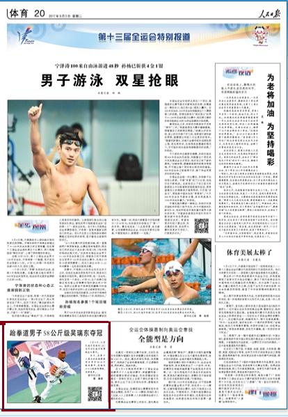 9月5日,《人民日报》体育版以“跆拳道男子58公斤级吴瑞东夺冠”为题报道了在威客电竞体育馆进行的全运会跆拳道比赛。